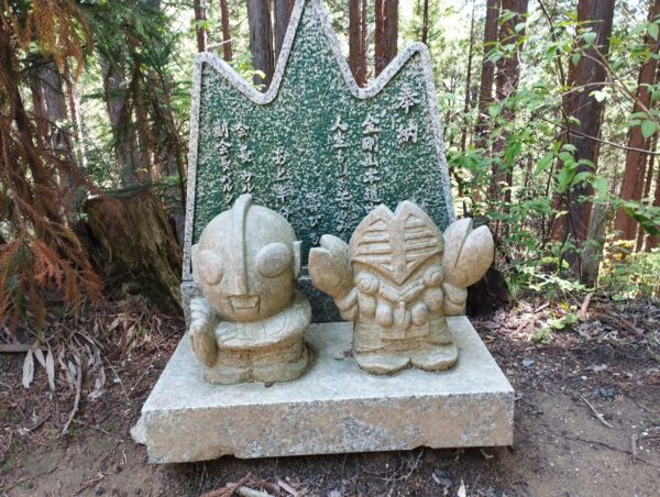 登山道の途中にあった「ウルトラマン」と「バルタン星人」の石像です。なかなか楽しい奉納物ですね。