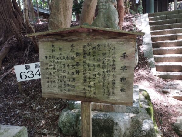「千早本道ルート」の途中に「千早城址」への分岐の案内看板があったので、そちらに向かいました。現在は「千早城址」の「本丸]跡に「千早神社」が建っているようです。