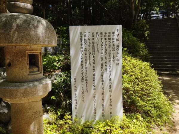 「千早城」の「御守り」の由緒の説明看板です。「千早城址」って「日本百名城」のひとつだったんですね。当時の大攻城戦を守り抜いたわけですから、武勲としての百名城入りなのでしょうね。その割には観光客が全然いないのですけど・・・。