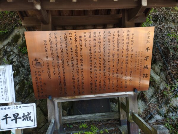 「千早城ルート」の登山口に降りてきました。ここに「千早城址」の説明看板がありました。