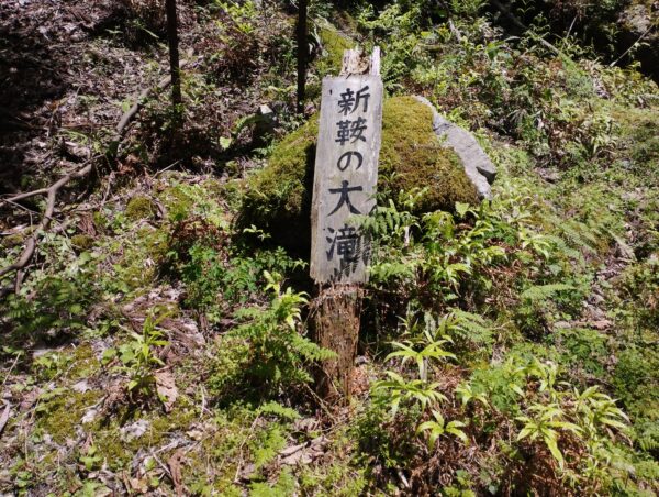 グーグルマップのマーカーの位置は当てにならないので、林道を戻りながら「新鞍の大滝」の案内看板を探しました。「夫婦滝」から1kmくらいの所で見つけました。往路ではまったく気付かなかったですね。