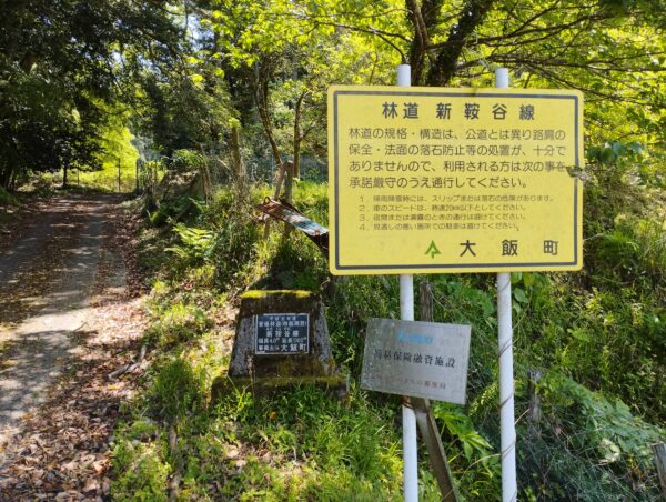「林道新鞍谷線」の入口です。すぐ先に害獣対策フェンスがあり、そこを開閉して林道に入ります。「おおい町」って今はひらがな表記なんですけど、以前は「大飯町」って書いたんですね。
