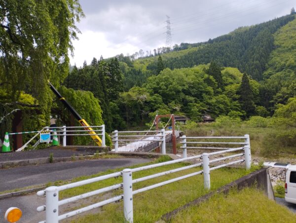 まずは「ファミリーマート亀岡馬路町店」でコーヒー休憩と昼食の調達をしました。最初は「九頭神社」からの予定でしたが、途中に「魚ヶ渕吊り橋」があるので、立ち寄ることにしました。ところが吊り橋は修理工事中で立入禁止でした。