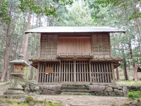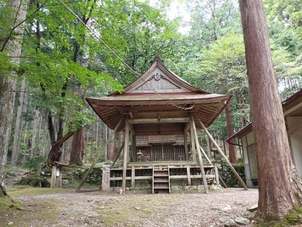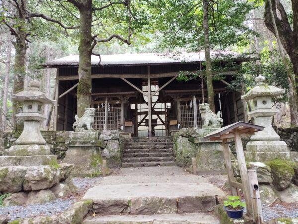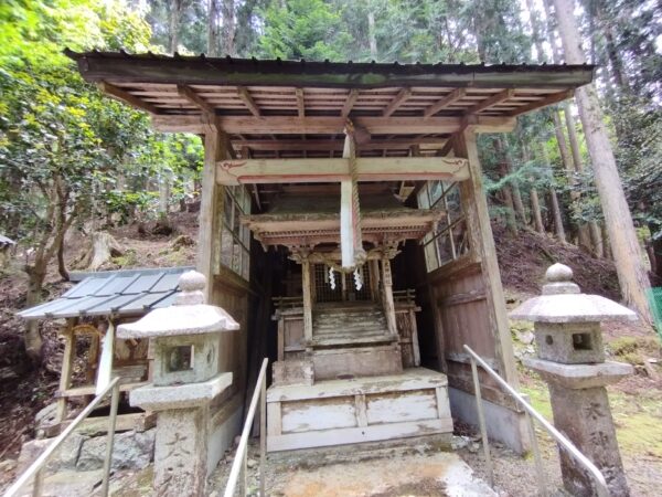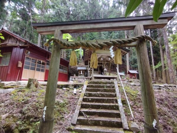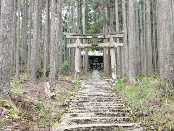 最後は「大山祇神社」に向かいます。この神社も害獣対策フェンスの先にあるため、グーグルマップに道がありません。府道443号線に林道の入口があり、害獣対策フェンスを開閉して進みます。