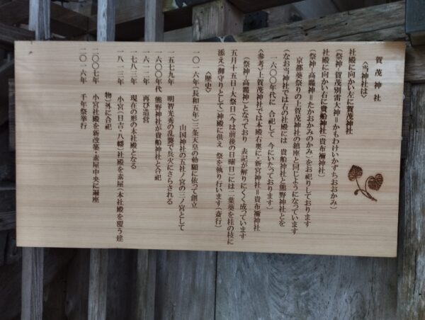 説明看板によると左側の祠が「賀茂神社」、右側の祠が「貴船神社」だそうです。真ん中の小さな祠については不明です。