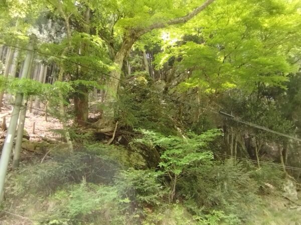 「灰屋川の岩神」です。写真では山の斜面にしか見えませんが、巨大な岩があります。(もっと右手から撮れば良かったと後悔しています。)「岩神」ということは、わたしの好きな巨石信仰ということですね。