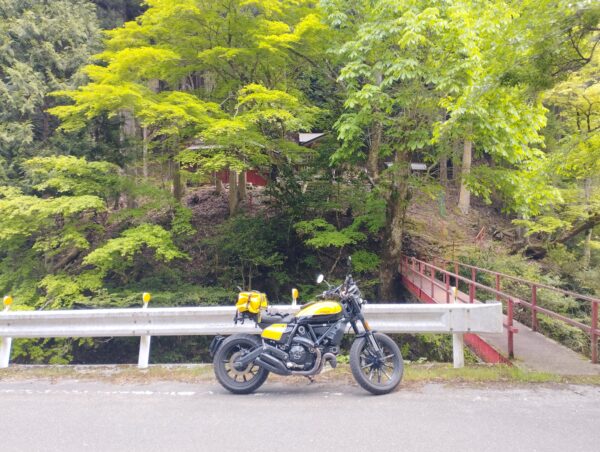 「灰屋川の岩神」の少し先に「太神神社」があります。神社にはバイクの右手にある赤い橋を渡ります。鉄製の橋なのですが、足元がペラペラした感じがして少し怖かったです。
