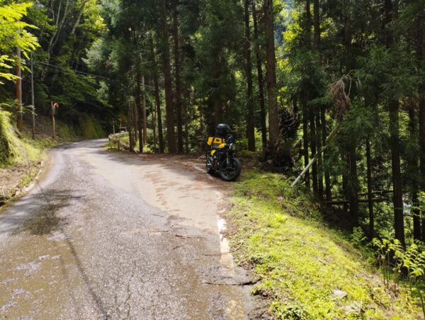 さらに先に進んで「灰屋の滝」に到着しました。バイクは滝より少し先のエスケープゾーンに、Uターンして駐めています。