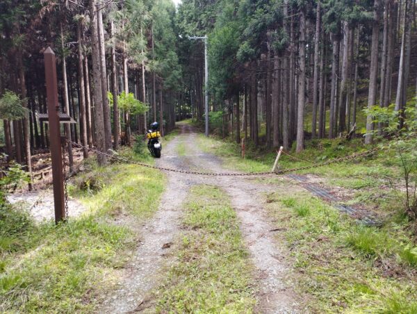 案内看板に従って山の方に歩いて行きます。実はグーグルマップの「賀茂神社駐車スペース」というマーカーを目指していたのですが、この先の害獣対策フェンスを越えた所を指しているみたいでした。この時はよくわからなかったので、三叉路の角にバイクを駐めました。