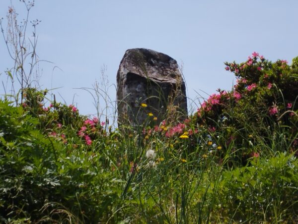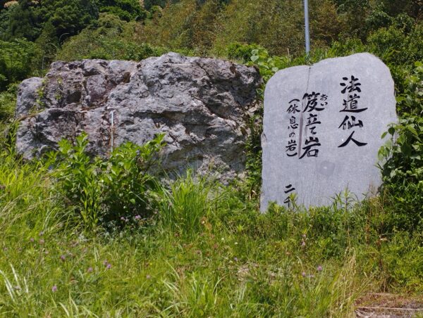 次は「岩戸寺」に向かいます。バイクは正門前の広場に駐めました。その広場の前に「笈立て岩」がありました。「法道仙人」(「岩戸寺」を開基された方)が休息された岩ということです。