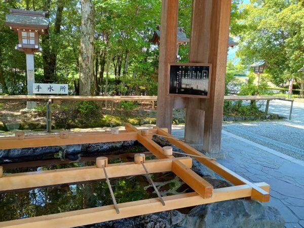 「南手水舎」です。「畝傍駅」からの帰りに「北参道」の入口の前を通りました。そちら側に「北手水舎」があるみたいです。光ってよく見えませんが、手水の作法が掲示されています。もちろん作法に則って手水を使いました。