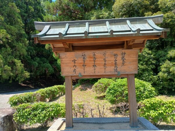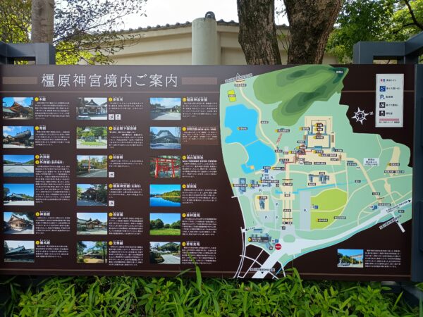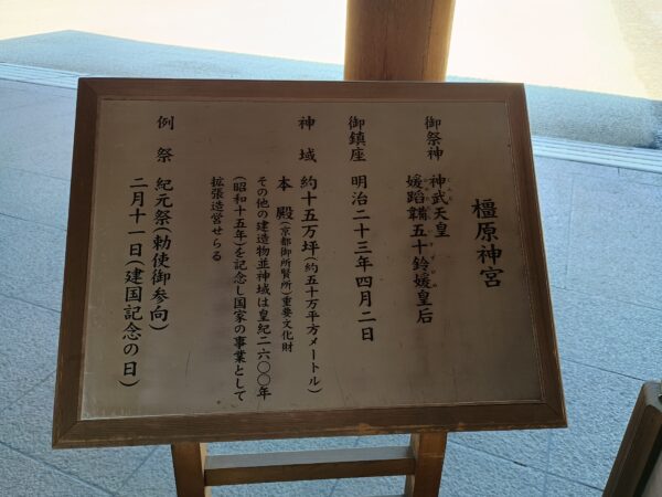 駐車場の入口に「橿原神宮」の案内看板がありました。約15万坪もあるので広いですね。