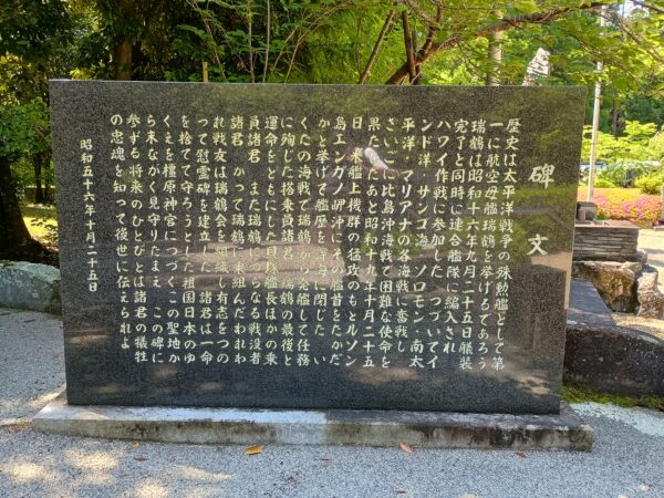 「航空母艦瑞鶴之碑」の右側にある「碑文」です。