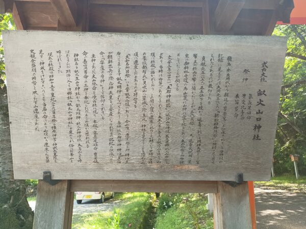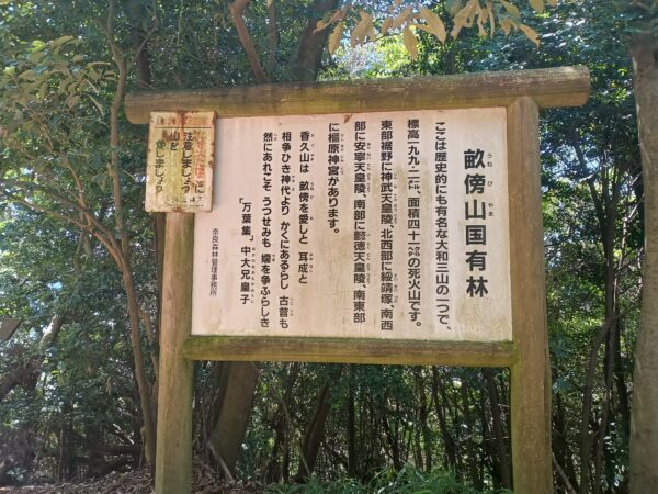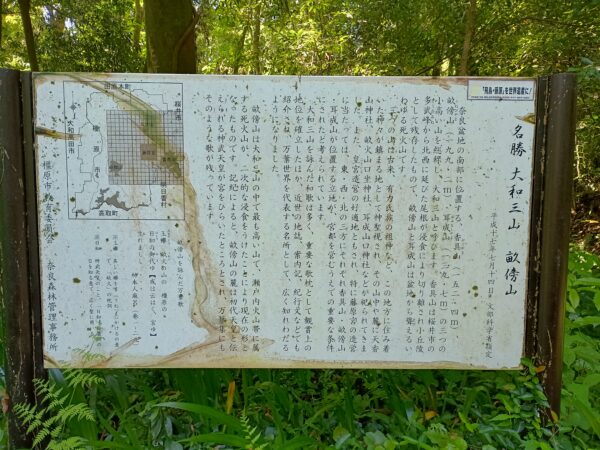 「拝殿」の横から登山道に戻りました。「大和三山」と「畝傍山」についての説明看板がありました。