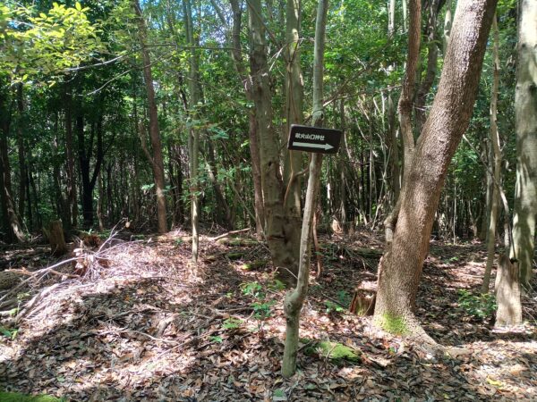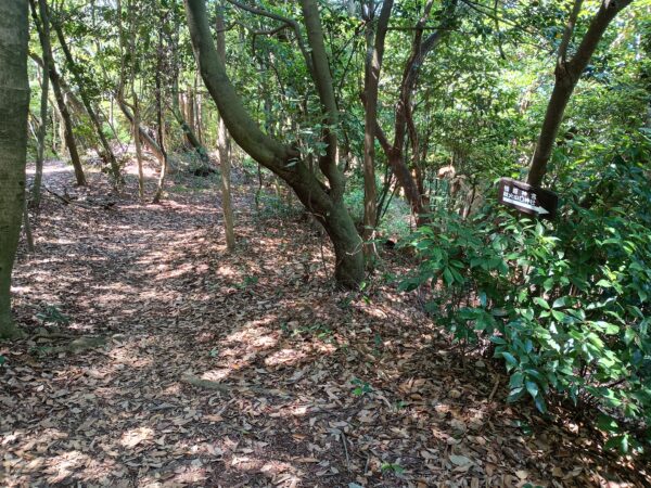 「頂上」方面に進むと、すぐにY字路になります。おそらく右側は「急坂コース」、左側は「ゆるやかコース」だと思われます。軟弱者は「ゆるやかコース」一択です。