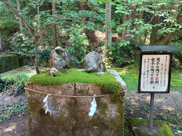 「拝殿」に右側に子授けの石がありました。「畝火山口神社」は安産の神様です。
