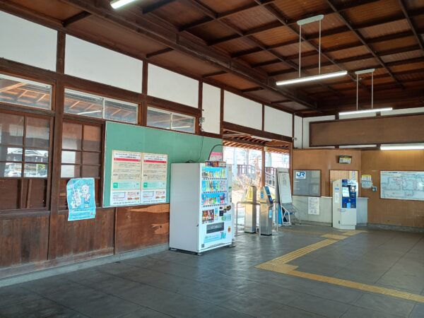 「畝傍駅」の駅舎内の様子です。無人駅なので閑散としています。ここで休憩がてら昼食をいただきました。