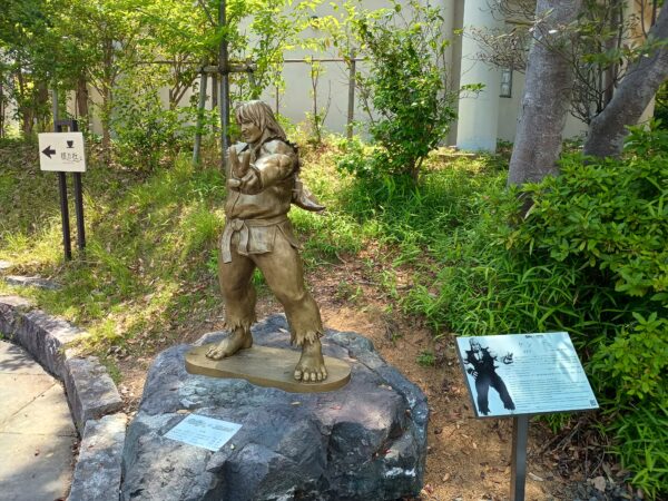 駐車場の手前に「ストリートファイターのケン像」があります。「畝傍駅」の駅前通りの街灯にも「ストリートファイター」とのコラボ・フラッグが飾られていました。