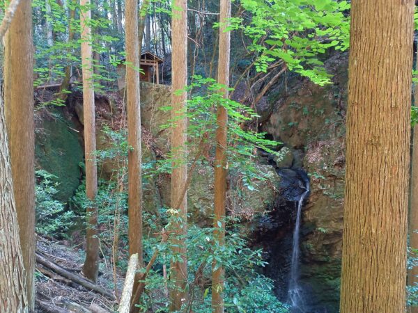 昼前に帰るので昼食の調達はせず、まずは「不動明王の滝」に向かいました。途中から林道が泥濘んでいたので、バイクを駐めて徒歩で向かいました。滝の方が先に視界に入るのですが、滝の上に祠があります。