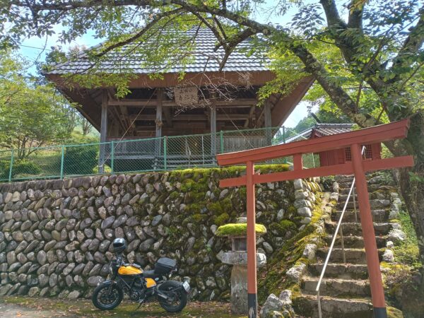 次は「熊野神社」の奥にある「不動の滝」へ向かいます。府道51号線を少し戻り、左折して橋を渡って上乙見方面へ向かいます。今日はなぜかグーグルマップではこのルートが通行禁止になっていました。ゲリラ雷雨で通行禁止にしたまま解除されていないみたいですね。実際は普通に走れました。バイクは公民館の道端に駐めました。上はお寺ですね。