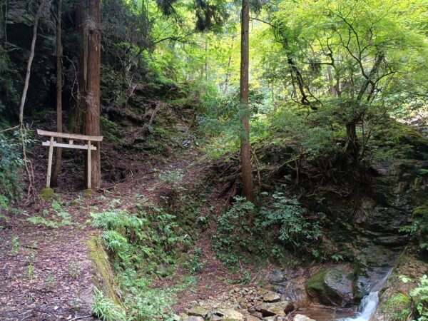 神社へ向かう橋を渡らずに左手に進むと、小さな「鳥居」が見えてきます。その右手に「不動の滝」があります。
