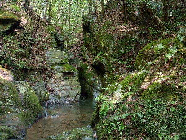 遊歩道の終端まで来ました。滝は正面の奥にあるので、ここからは見えません。滝を観るには、川に中を進むか右手前の岩によじ登るしか有りません。わたしは岩に登りました。