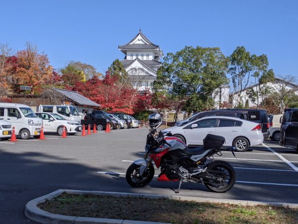 「園部城址」は平地のお城で、今はその場所に「京都府立園部高等学校」が建っています。まずは「園部総合公園駐車場」にバイクを駐めると、何やら復元されたお城らしき建物が見えます。