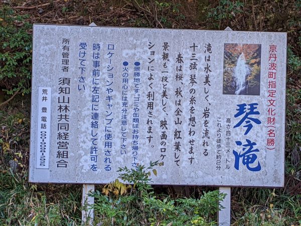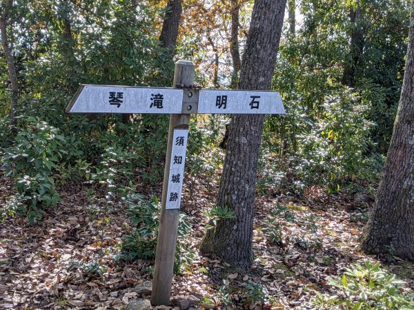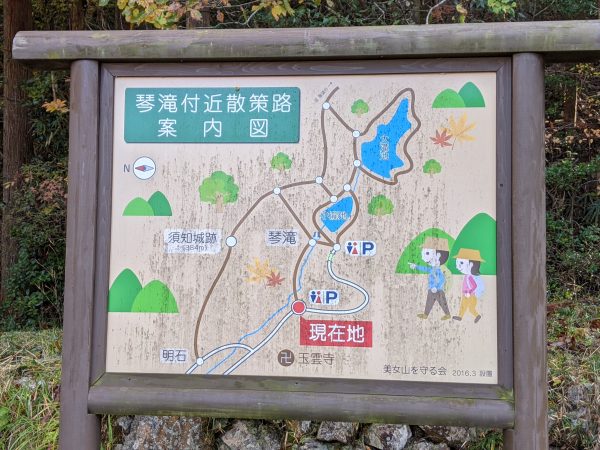 「須知(志宇知)城址 」は「玉雲寺」というお寺の近くにあるようなので、そこを目指して行きました。わたしは知らなかったのですが「琴滝」という有名な観光地の近くでした。案内図を見ると、「琴滝」経由で 「須知(志宇知)城址 」に行けるみたいです。結果的に、「琴滝」→ 「須知(志宇知)城址 」→「明石」というルートで山を縦走しました。