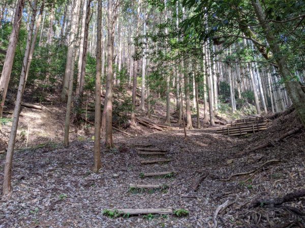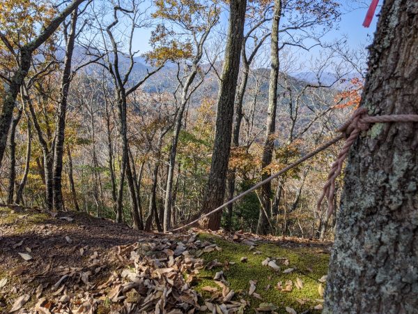 ここからは 「須知(志宇知)城址 」を目指して登山です。この登山道は階段は少なく、斜面を登っていくスタイルでした。要所要所に赤いリボンで目印があって、道を間違えないように工夫されていました。森の中を登る感じがポイント高いです。