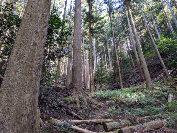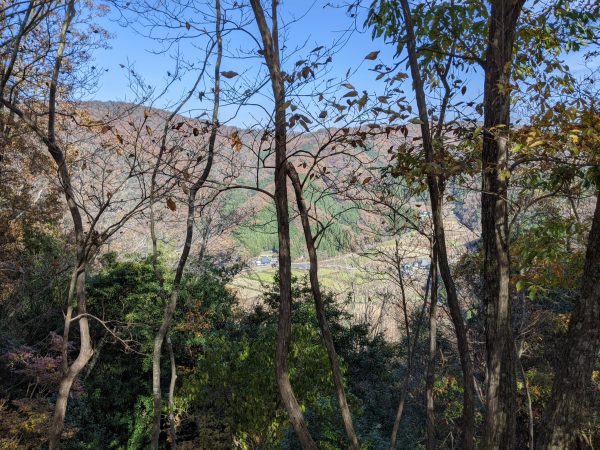 帰りは同じ道を戻るのではなく、山を縦走して「明石」という場所に降りることにしました。降りはかなりの急斜面で、落ち葉で滑ります。危ない場所にはロープが張られていて、それにつかまって降りました。(でないと足を滑らせて転ける可能性大。)