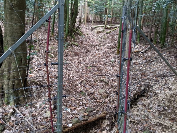 これが電気柵です。横に電線が通っていて、間を通り抜けるのは無理なのであきらめました。次の「東山城址」で気づいたのですが、電線の右側に見える黒い棒状のものがスプリングを内蔵した引っかけカギで、ここを掴めば感電することなく電気柵を外すことができます。