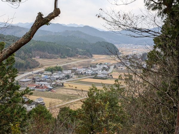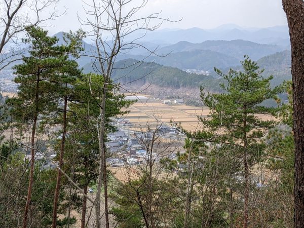 登ること約15分で「本郭」跡に到着。石碑とかはなく、案内看板があるだけです。ここで昼食をいただきました。ベンチもなにも無かったのですが、次に行った「淀山城址」にはベンチがありました。そんなに高い山ではないので、景色はまあまあって感じです。