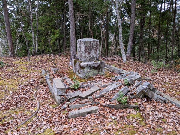 登ること約10分で「本郭」跡に到着。 こちらの方が「東山城址」より低いですね。「淀山城址」には石碑のようなものがあるのですが、土台部分がかなり崩れていました。看板の左に簡易ベンチがありました。こっちで昼食をとりたかったです。