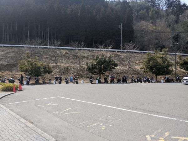 「道の駅 スプリングひよし」のバイク置き場はこんな感じで、ずらっとバイクが駐まっていました。そういえば、今日はあほな走りをするようなバイクは見かけませんでした。マナーも向上してるのかな。