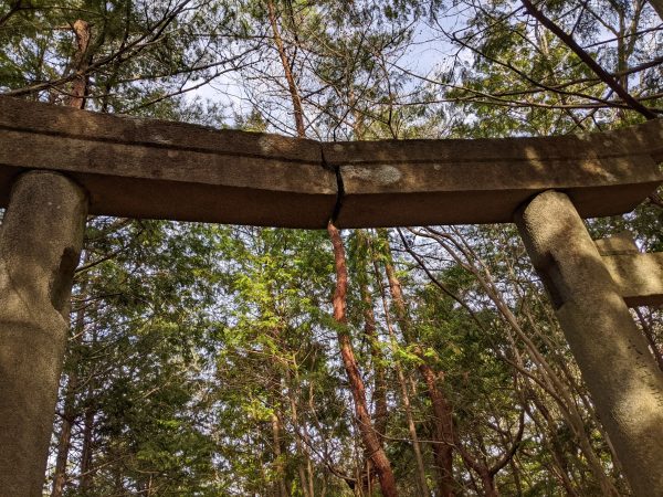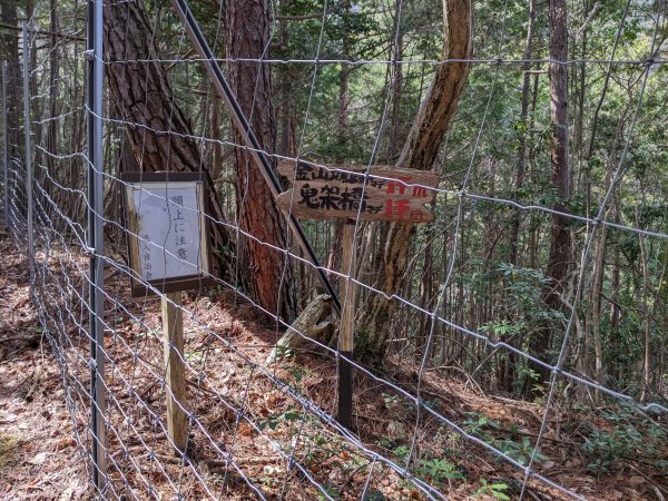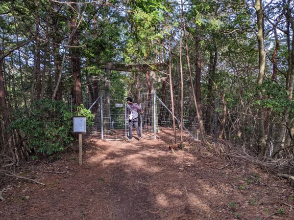 この登山道にも害獣対策フェンスがあるのですが、フェンスの向こうにある鳥居が倒壊しそうな状態でした。下を通過中に地震が来たら危ないですね。
