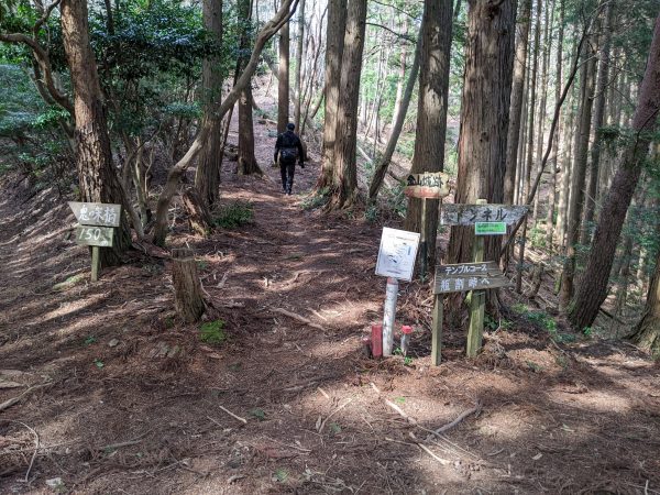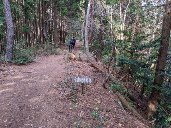 登山道は階段ではなく土の斜面です。でも落ち葉が少ないので滑ることはあまりありません。適宜案内看板があるのですが、なぜか「金山城址」より「鬼の架け橋」の方が案内が多いです。初めは、この2ヶ所は離れた場所にあるのかと思っていましたが、すぐ隣にありました。