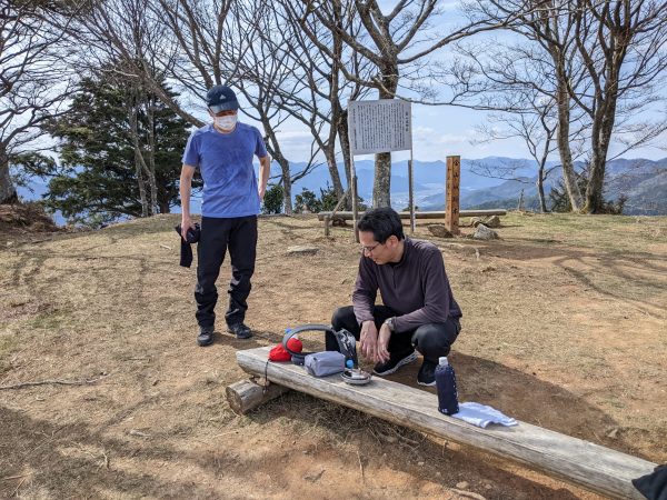 さて、城址についたらコーヒー(インスタントだけど)を淹れて休憩なんですが、前田さんが着火器具を忘れてしまってお湯が沸かせません。結局水で淹れたインスタントコーヒーを飲む羽目になりました。