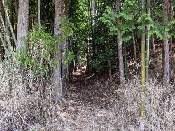 いちおう登山道だと思いますが、雨が降ったら川になるような道です。道幅は結構広いです。暫く進むと右手に道が現れます。グーグルマップによると、こちらが城址のある方向なので、右に曲がります。他の方のブログによると、真っ直ぐ行くと旧「歓楽寺」の遺構があるそうです。