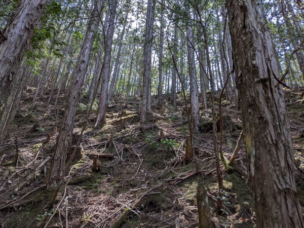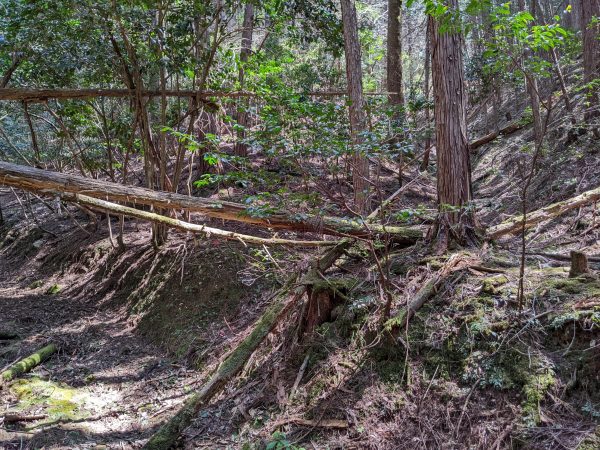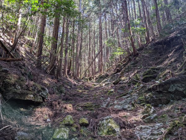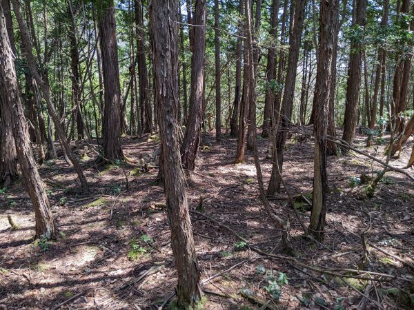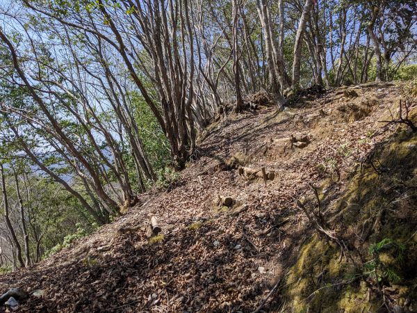 林道を進んでいくと、途中から左手の方に曲がっていくのですが、グーグルマップを見ると城址は右手の方にあります。この道が登山道なのかもよくわからないので、途中からグーグルマップの指す方向へ直登りしました。