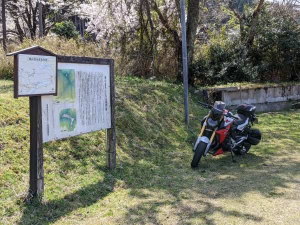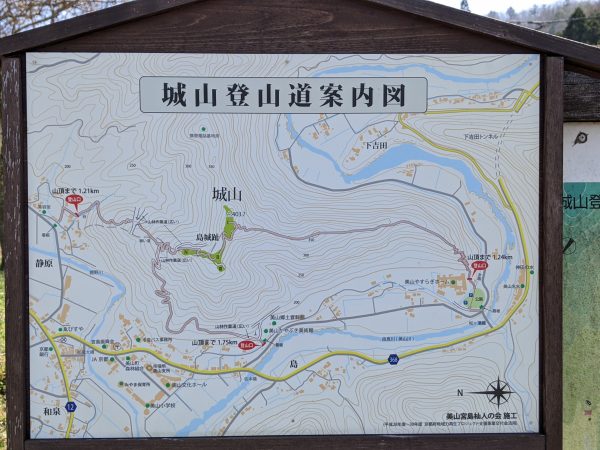 「島城址」の登山口は、ここからすぐの所にあります。バイクで数分移動するだけです。説明看板のある場所には、十分な駐車スペースがあります。「城山登山道案内図」によると、ここは一番左側の登山口のようです。