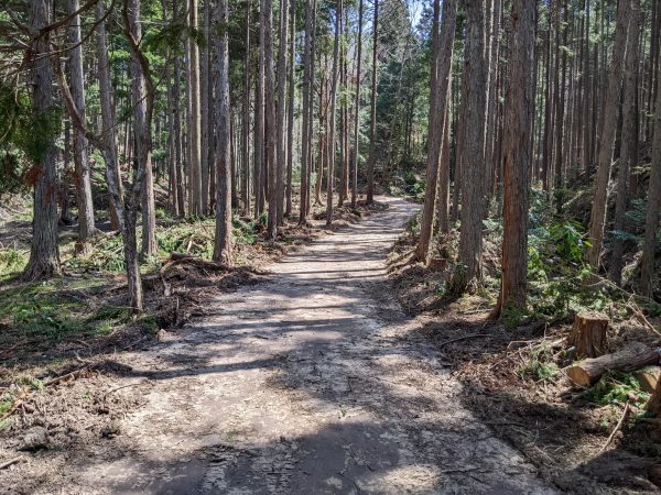 「城山登山道案内図」の写真を見ながら歩き始めたのですが、どこが登山道の入り口なのかわかりません。案内看板等はまったく見つかりませんでした。で、適当に山の方に向かうと、かなり広めの林道があったので、道なりに進みます。