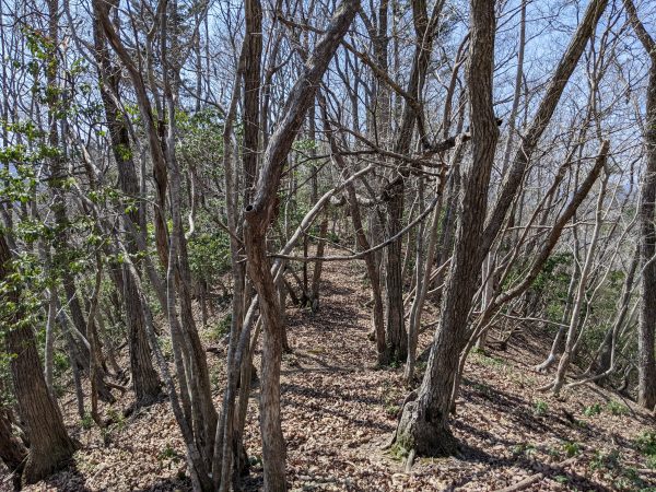 グーグルマップを見ると右手の方に城址があるようなので、この鉄塔を右回りに迂回すると、本来の登山道に出ました。ふたつの山の尾根を渡る道でした。