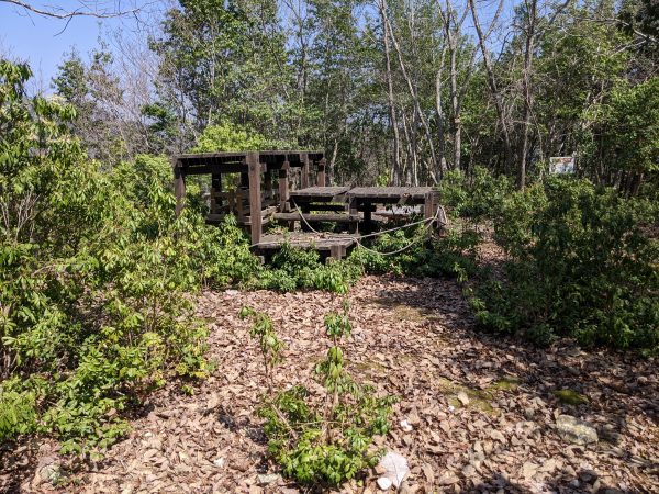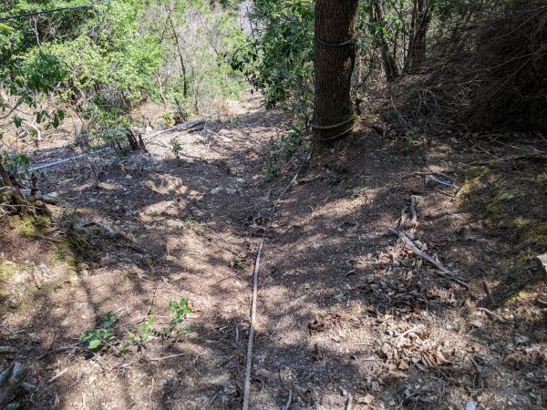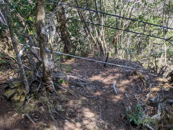 帰り道は登山道を確認しながら帰ろうと思いましたが、鉄塔のすぐ下付近で伝い降りるためのロープが張られていました。おそらく基地局の整備用だと思われます。真っ直ぐ進めば登山道のようなのですが、ふと魔が差してロープで降りてみたくなりました。