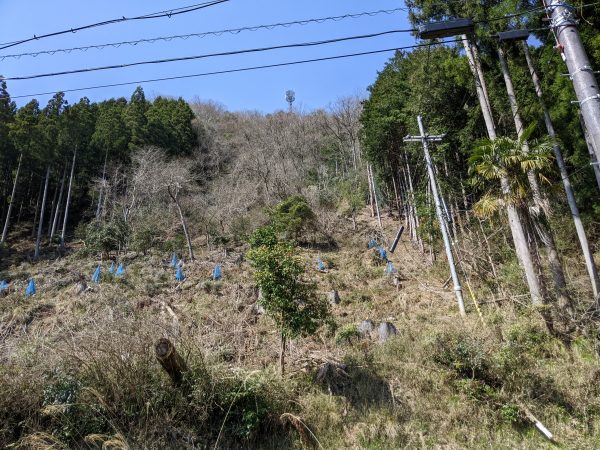 直登りの結果、山の頂上にある鉄塔(「城山登山道案内図」によると携帯電話基地局らしい。)にたどり着きました。