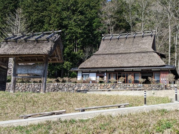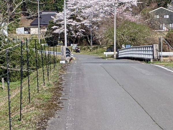 バイクを置いた場所までとぼとぼ歩いている途中です。桜が満開で綺麗です。「美山かやぶき美術館」なんてのがありました。(疲労困憊なので入っていません。)