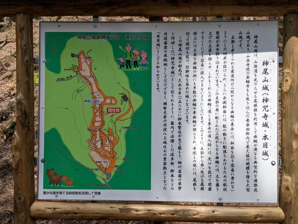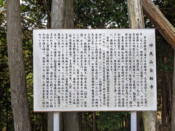 てことで、「神尾山(かんのうざん)城址」へ行ってきました。「神尾山城址」は「神尾山金輪寺」から登れます。まあ、「金輪寺」までの林道が、いちおう舗装されているけど、かなりの酷道なのが泣けます。(オンロードバイクだと、細かいがれきや苔が怖いです。)