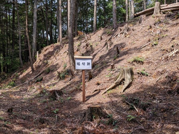 「堀切」跡及び「本郭」付近です。「本丸」跡は、もう少し先にあります。説明看板によると、かなりの規模の城郭だったようです。