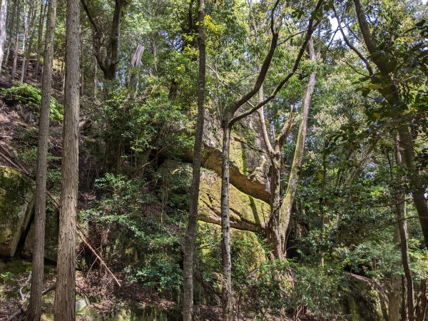 登山道を戻って「天狗岩」に向かいました。説明看板が見当たらないので、ここが「天狗岩」だという確信はありませんが、天狗でなければ運べない岩って感じなので、ここだと思います。