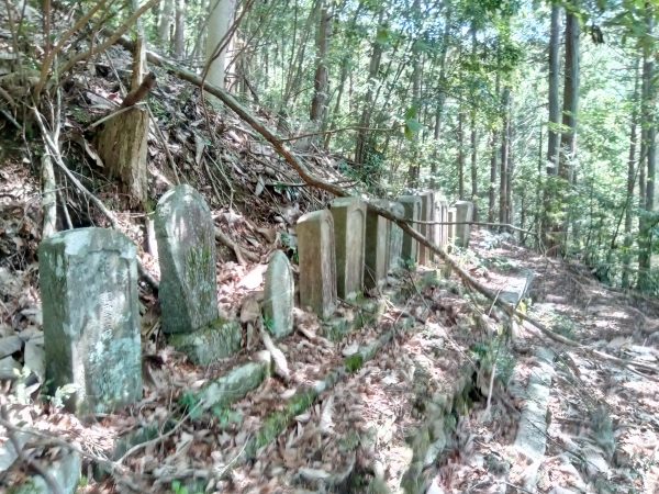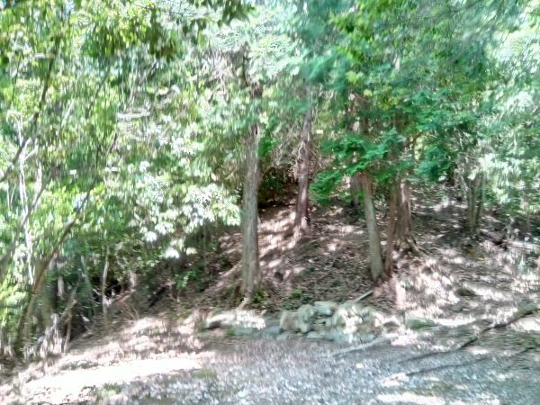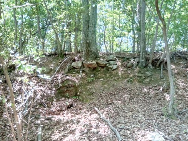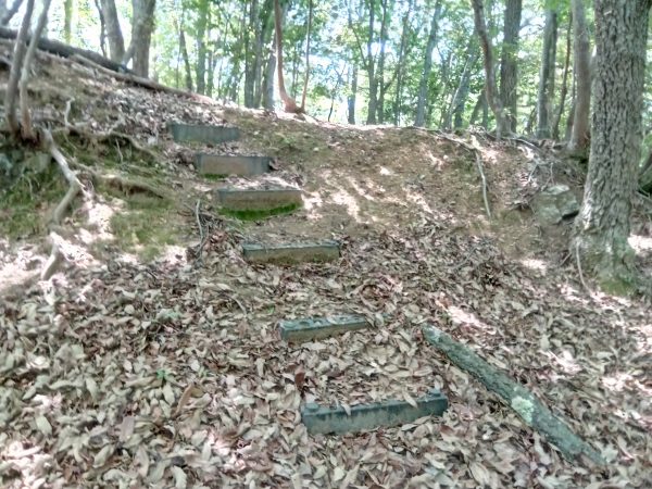 「本郭」跡の直前には石垣の遺構があり、その右手には簡易な階段が設置されています。これは「本郭」跡に関西電力の鉄塔があるためで、保守用のものと思われます。