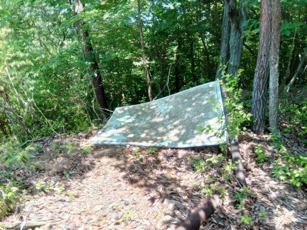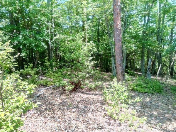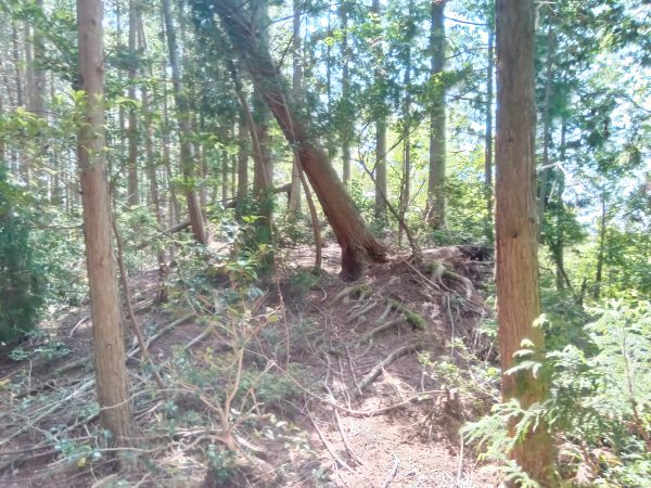 墓石がなくなったら直登りします。まともな道はないので強行突破って感じです。尾根に出ると、倒れて傾いた木があり、これが帰りの目印なのですが、帰りはここにたどり着けませんでした。「東掛城址」も「新庄城址」に続いてグーグルマップの位置が間違っており、城址を探して山の中をさ迷っていたら、なぜかこの傾いた木に戻ってきてしまうことはありましたが・・・。